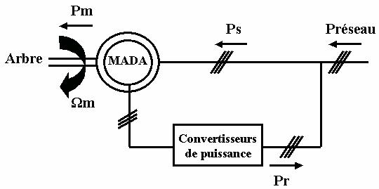 Uma eólica utilizando uma MADA permite extrair uma potência máxima a partir de uma determinada velocidade do vento, optimizando a sua velocidade específica ? e minimizando as restrições mecânicas sobre a turbina devido às rajadas de vento. A velocidade específica ? é a relação entre a velocidade na extremidade das pás da turbina e a velocidade do vento. A potência da turbina eólica é convertida em potência eléctrica e é transmitida à rede através dos enrolamentos do estator e do rotor.